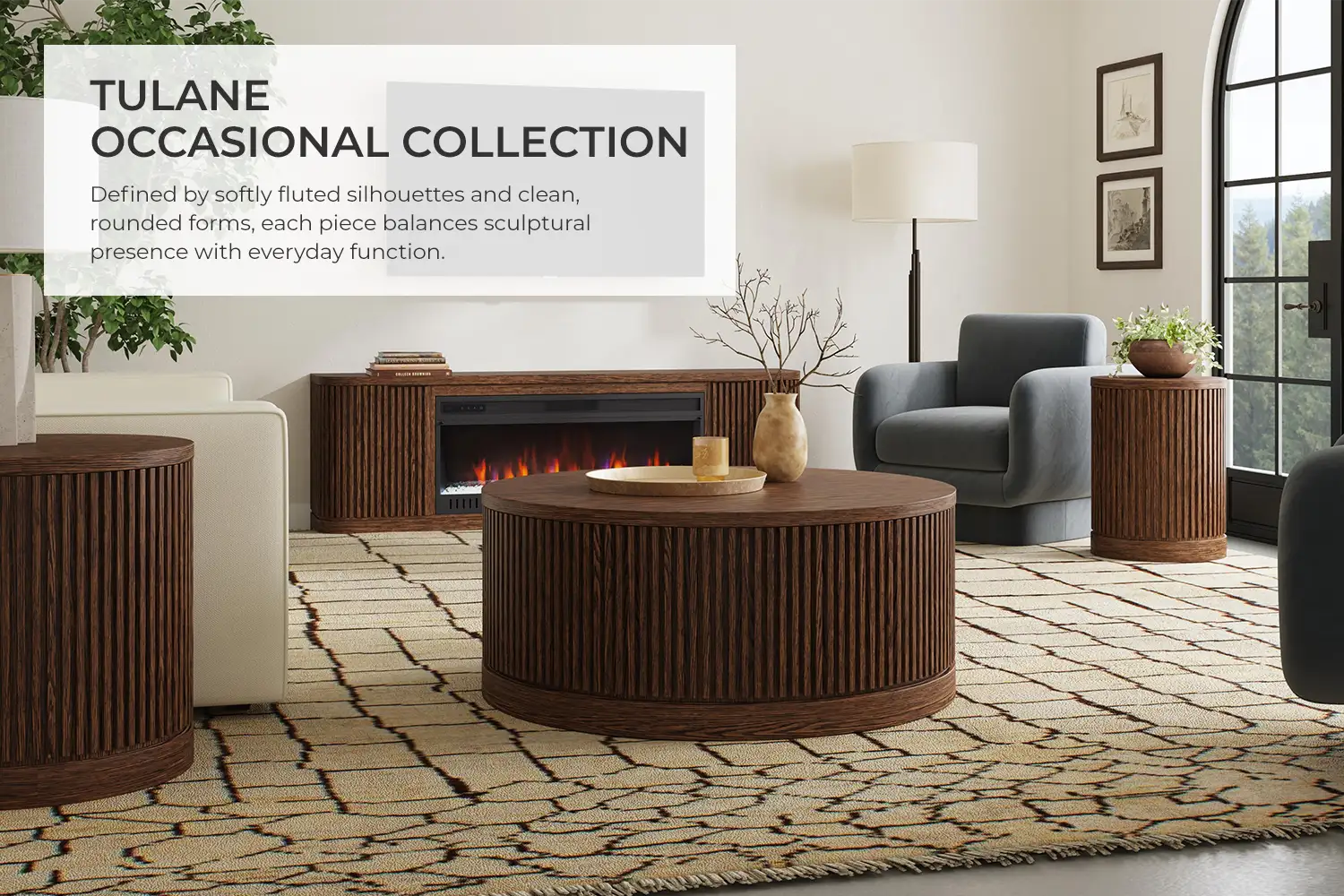 The Tulane Occasional Collection brings refined structure and timeless warmth to modern living spaces. Defined by softly fluted silhouettes and clean, rounded forms, each piece balances sculptural presence with everyday function—perfect for layering, displaying, and gathering.