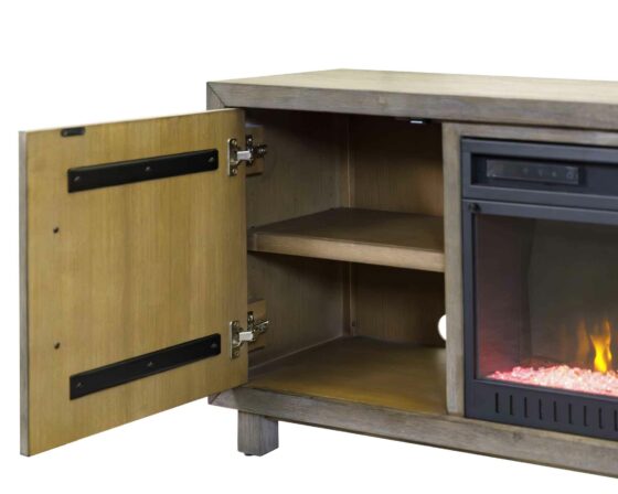 $1,310.00 Free Shipping on All Orders* Relish the presence of a cozy crystal glass fireplace with realistic flames year-round, without or with heat and temperature control High efficiency infrared heating more evenly heats the room and leaves humidity in the air creating a more pleasant home environment. Heats up to 400 sq ft Enjoy the LED-lit fire display with 4 flame settings that alternate color and offers 12-hour programmable with the convenience of a remote control The protective ‘Cool Touch’ feature minimizes heat transfer to surrounding surfaces and electronics allowing you to customize your console with your favorite décor and electronics The overheating control device will automatically turn off to prevent the heater from reaching an unsafe temperature Accommodates up to 85” Flat-panel TVs and features a 42″ firebox insert Using a standard US outlet allows placement in any room in your home Two brushed gray finish self-closing doors with a herringbone design for private storage Two adjustable shelves to allow customization for your personal décor and electronics Cable management cutout to organize cords and keep console area clutter-free High quality construction for durability and long-lasting use Palisades boasts transitional luxury with a touch of glam that fits in perfectly with contemporary décor. Herringbone patterned door fronts with unique textured iron hardware lends an understated accent. Brushed gray finish has been distressed to highlight the wood’s natural grain. Available in 2 finishes — original gray and new charcoal. *For full warranty benefits, register your product at https://www.martinfurniture.com/contact-us/80″ Fireplace TV Stand